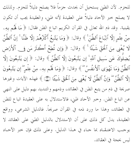 Then he brings verses in the Qur'an in which Allaah rebukes those who follow dhann (speculation), amongst the pagans and disbelievers, using these verses as proof that khabar ul-aahaad are not to be used in aqidah. These verses are in relation to those who follow their desires and whims, and not what Allaah revealed. Further there are other verses in the Qur'an in which taking knowledge from one person is established (9:122, 49:6) and wihch the Scholars of hadeeth have used to establish the acceptability of the narration of one person and that it amounts to knowledge (see later below). Then he (an-Nabahani) continues a little later saying:
